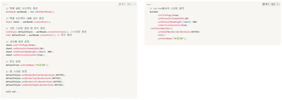 또한 해당 코드 스타일을 설계 과정에서의 문제는 일반적인 방식의 코드가 아니라는 점에 있었다. 해당 프로젝트에서는 Apache의 POI와 연계하여 코드를 제작하는 과정이었기에 참고할 코드가 존재하지 않았다. 이 때문에 범위 선정과 실제 구현에 있어서 예측할 수 없는 부분이 상당 부분 존재했다. 이 문제를 해결하기 위하여 Fluent interface의 코드 제공 범위를 전 범위에서 일부로 축소하고, 간단한 코드부터 참고하여 확장했다. 참고했던 코드의 경우 모던 자바 인 액션의 “chapter10 람다를 이용한 도메인 전용 언어”을 참고하여 프로토타입을 만들었다.