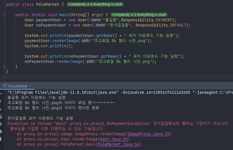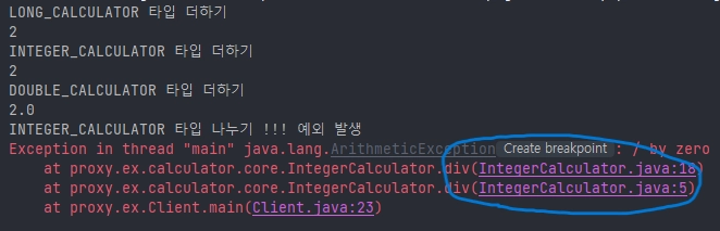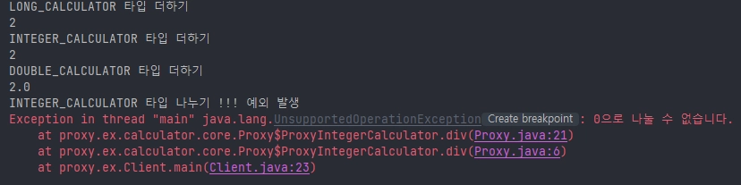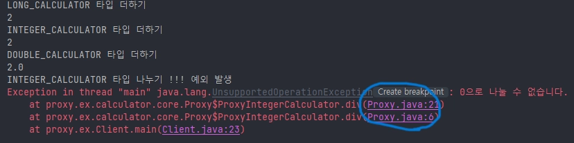 근데 신기한 점을 여기서 찾아볼 수 있다. 잘 찾아보자. 아래를 보면 사용 전에는직접적인 구현체, 프록시 적용 후에 예외에서 프록시 객체가 예외 스택에 나온다. 이처럼 예외가 발생하더라도 프록시 객체가 예외에서 나오기 때문에 원본 객체가 보호가 되는 것이다. 이 예제에서 기준으로는 0은 div()의 두 번째 파라미터로 들어올 수 없다. 즉, 권한이 없는 것이다. 이를 프록시에서 미리 감지하고 킥 시키거나 우회시킬 수 있는 것이다.
