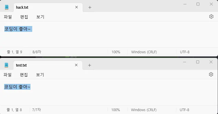두 개의 파일은 동일하다. 단 한 가지 다른 부분은 hack.txt 에 제일 마지막 문자는 스페이스가 하나 들어가 있다.