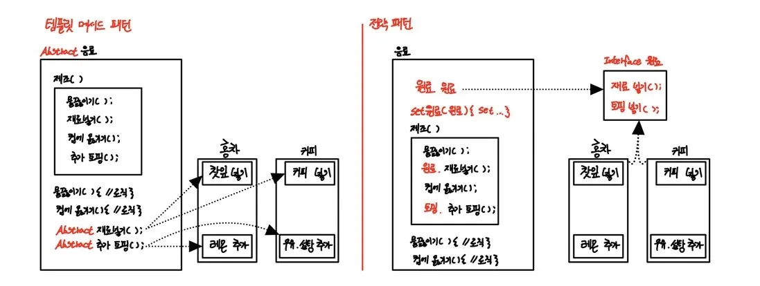 결론적으로 동일한 실행 과정을 거치지만 일부 과정이 다른 클래스의 실행 과정을 서브클래스로 위임하는 것이다. 이렇게 된다면 사용자 입장에서는 뜨거운 음료 레시피(홍차 or 커피) 만 넣어주면 알아서 모든 단계가 실행된다. 그런데 여기서 조금 특이한 점이 있다. 전략 패턴과 비슷하지 않은가? 하지만 다르다. 왜냐하면 전략 패턴의 경우 홍차가 뜨거운 음료 레시피 내부에 포함 되어져 있을 것이다. 템플릿 메서드 패턴의 경우는 포함 된 것이 아닌 위임이다. 아래는 동일한 홍차와 커피를 템플릿 메서드 패턴과 전략 패턴으로 만들었을 때의 그림이다.