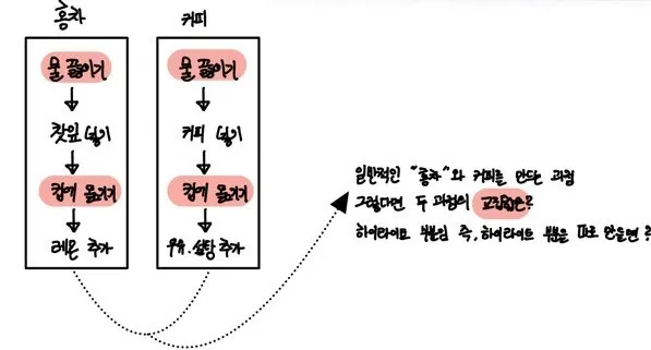 일반적으로 홍차와 커피를 만드는 과정은 다음과 같이 정의할 수 있다. 그런데 생각해보면 동일한 순서를 가지고 있었던 것이었다. 하지만 다른 점도 있었다. 이 과정을 어떻게 해야 더 편하게 정의할 수 있을까?