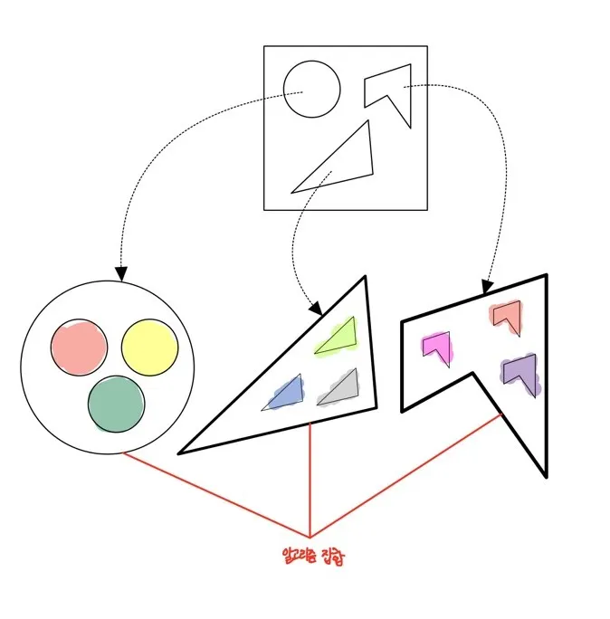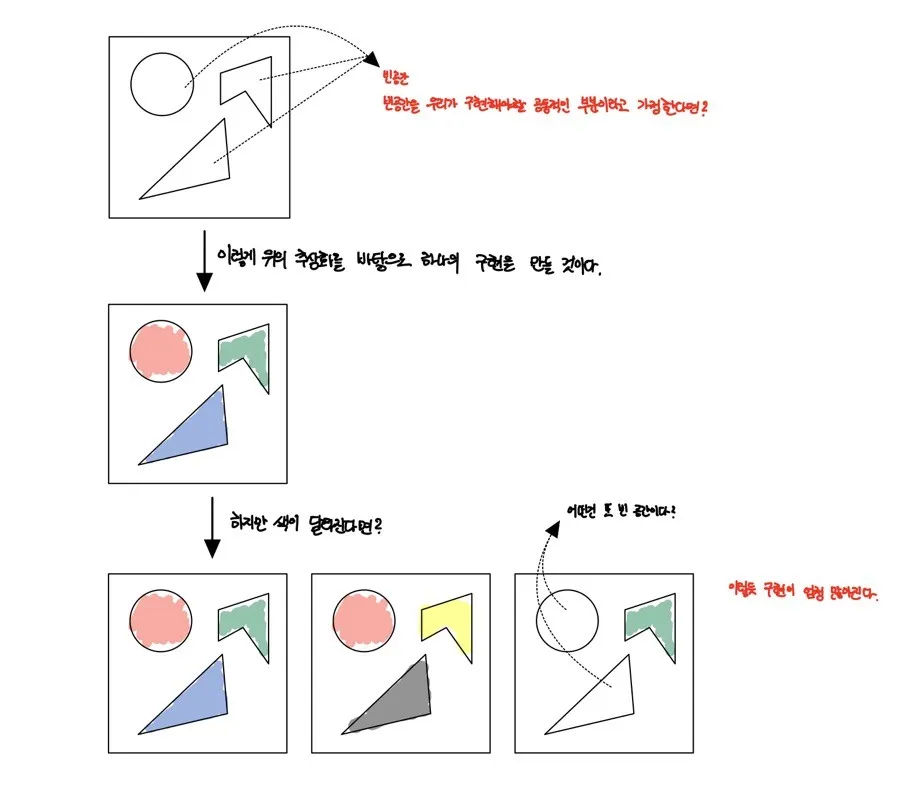 여기서 한 가지 의문이 생길 것이다. 빈 공간의 크기에 맞는 여러 색의 도형을 만들면 되는거 아니야?