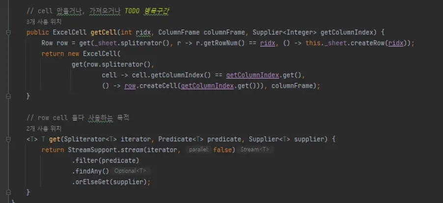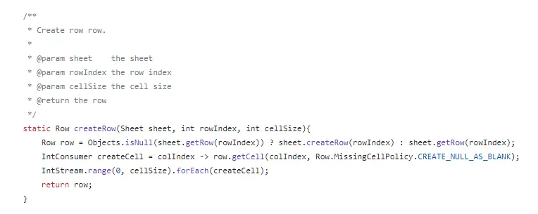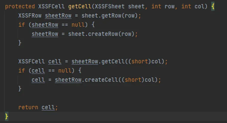 해당 현상의 원인이 되는 코드 이다. 이 코드로 인하여 하나의 셀을 제작하는 과정에서 병목현상이 일어나 약 100,000 개의 셀 정도를 삽입하는 과정에서 성능이 저하되었다. 초기에 이렇게 코드를 디자인했던 이유는 엑셀의 경우 Row(행)에서만 Cell(스프레드시트의 가장 작은 단위)을 만들 수 있었기 때문이다. 이 때문에 곧바로 Row에서 없는 Cell을 가져오려고 한다면 적절한 예외처리가 되지 않고 NullPointerException이 발생했다. 이로 인하여 예외가 발생하지 않고, 항상 Cell을 생성하여 넘겨줄 수 있도록 하기 위하여 초기에 코드를 제작했다. 하지만 결과적으로 성능이 매우 저하되는 이슈가 생겼다. 그래서 POI 내부 구현을 찾아 Cell 생성 정책 설정을 통하여 코드를 수정했다. 결과적으로 동일한 실행 시에 10초 이내로 성능을 개선할 수 있었다.