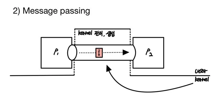 커널이 하나의 설비를 만들어서 이를 메시지라는 형태로 주고 받게 해주는 설비다. 당연히 운영체제의 개입으로 인하여 공유 메모리 모델 보다 상대적으로 느리다.