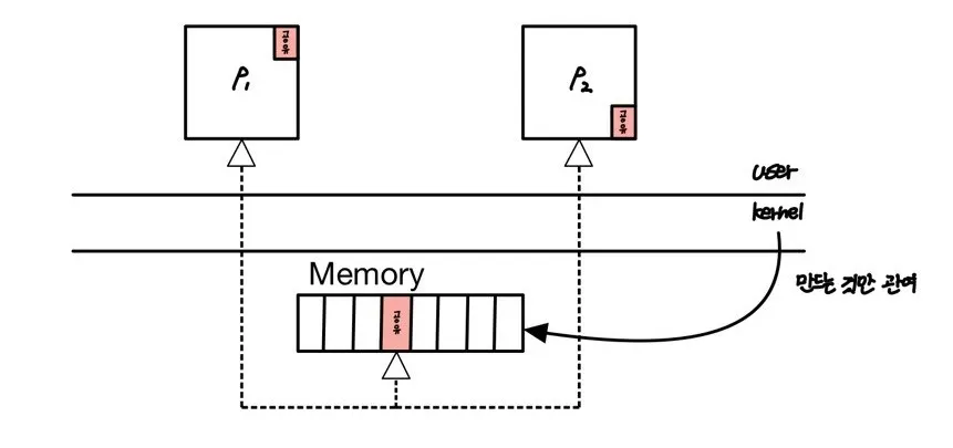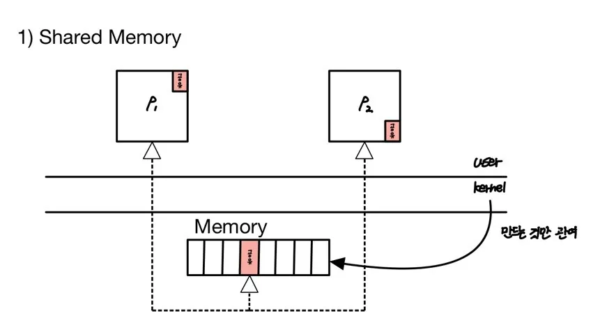메모리를 공유한다. 즉, 다른 각각의 프로세스들이 공동의 메모리 영역을 참조하여 사용한다. 또한 확장해서 생각해보면, 데이터의 일관성이 무너지거나, 경쟁할 수 있다. 즉, 동기화 기술이 필요하다.
