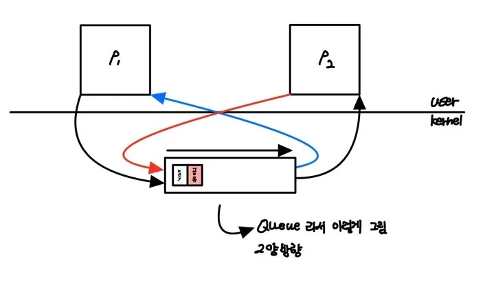 이 부분은 사실 맞다라고 이야기하기 힘들 것 같다. 어떤 사람은 단방향이라고 한다. 그래서 확신은 없지만 내 생각에는 양방향이다. 왜냐하면 pipe의 경우 한쪽으로 들어가는 건 똑같지만 원하는 데이터를 가져오리란 보장이 없다. 그래서 두 개의 입력/출력 파이프를 만들어야 했다. 하지만 메시지 큐의 경우 한 방향으로 보내도 원하는 데이터의 키만 알고 있다면 원하는 데이터를 가져올 수 있다.