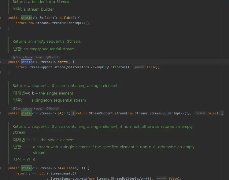 처음엔 이걸 왜 만들었을까? 이런 생각을 조금 가졌다. 하지만 해당 기능은 유용한 코딩을 제공한다. 예를 들면 우리의 절친 Stream에서 조금의 해답을 찾을 수 있었다. Stream에서 제공하는 기능은 안다고 생각하고 static이 붙은 메서드와 구현하여 사용하는 메서드 두 종류가 존재한다. 근데 이게 API를 유심히 보다보니 특이점 하나를 발견할 수 있었다.