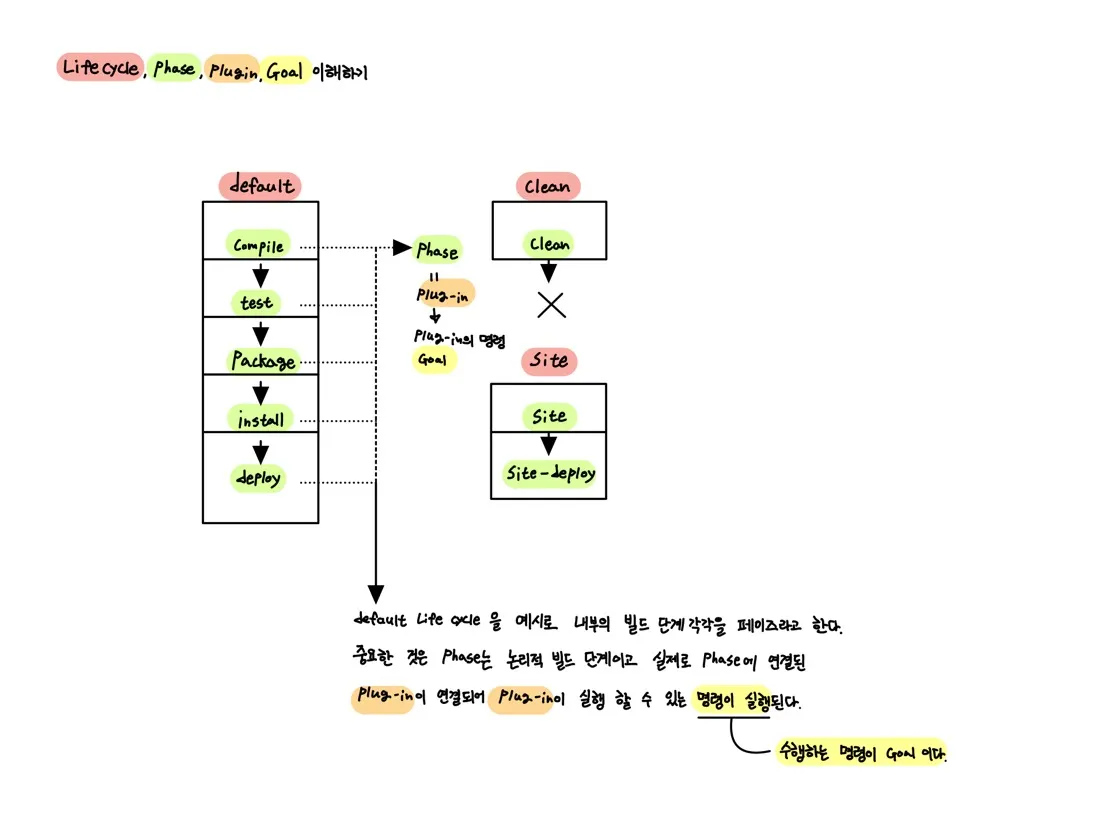 Lifecycle(붉은색) : Phase들의 순서가 있는 집합이다. 기본적으로 default, clean, site 가 있으며 각각의 Lifecycle은 고유의 빌드 순서(phase들의 실행 순서)가 있다. 또 하나 중요한 점은 Lifecycle상에서 임의의 phase만 실행은 불가능하다. 모든 phase를 순서대로 실행해야 실행된다.
