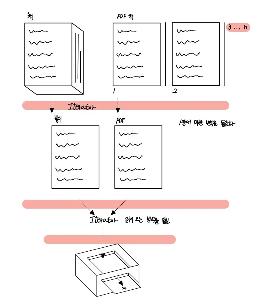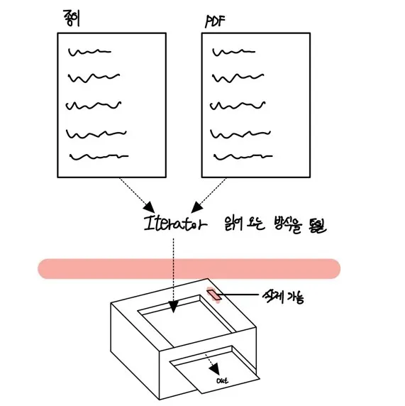 만약 책과 PDF로 된 전자책이라면 어떨까? Iterator를 적용하기 전처럼 변할 것이다. 왜냐하면 책은 종이들의 집합이고, PDF 책은 PDF들의 집합이기 때문이다. 하지만 동일하게 Iterator를 적용하면 간단하게 해결할 수 있다. (여기서 책의 의미는 종이가 여러 장 들어오거나, PDF가 여러 장 들어올 때 이다. 이를 일반화 시켜 사용하는 방법이다. 꼭 종이, PDF가 아니더라도 xml, yml 등도 book 인터페이스만 구현하면 자유롭게 출력이 가능해진다.)