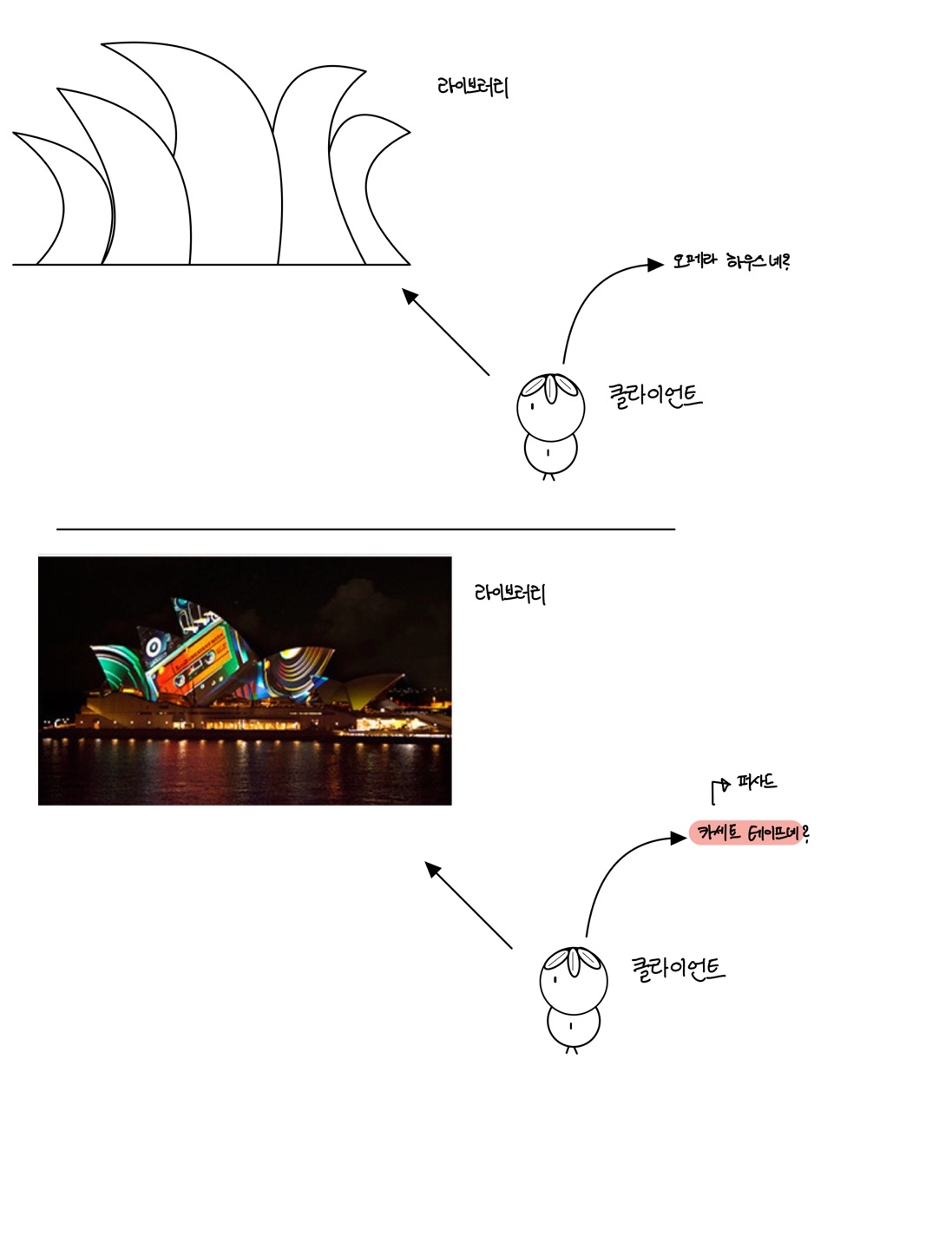 퍼사드 패턴은 다음과 같은 관계를 가진다. 기존에 관광객이 오페라 하우스를 바라볼 때 오페라 하우스의 복잡한 모양을 먼저 보고 인식하고 해석한다. 하지만 오페라 하우스의 외관에 카세트 테이프의 영상을 비췄을 때는 관광객이 카세트 테이프를 바라보게 되는 것이다. 이걸 라이브러리와 클라이언트의 관계로 해석해보자면 기존에는 복잡한 라이브러리를 직접 사용했다면 퍼사드를 이용하여 클라이언트가 퍼사드를 인식하게 만드는 것이다.