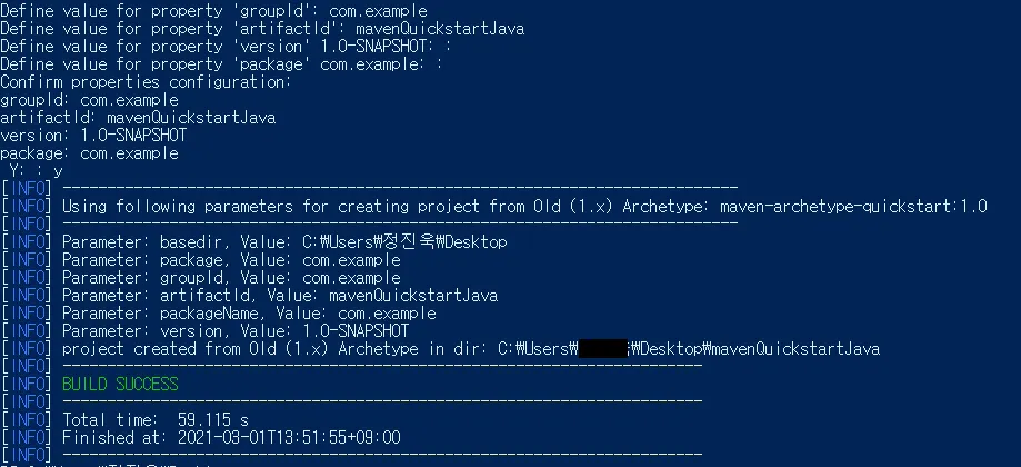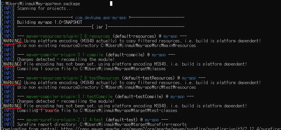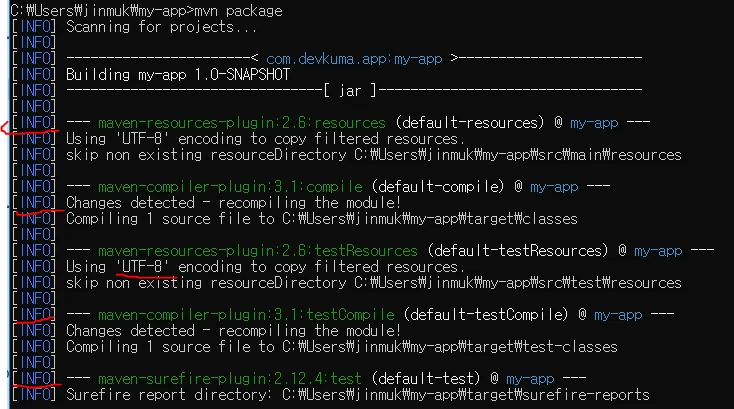 $ mvn archetype:generate -DgroupId=com.devkuma.app -DartifactId=my-app -DarchetypeArtifactId=maven-archetype-quickstart -DinteractiveMode=false